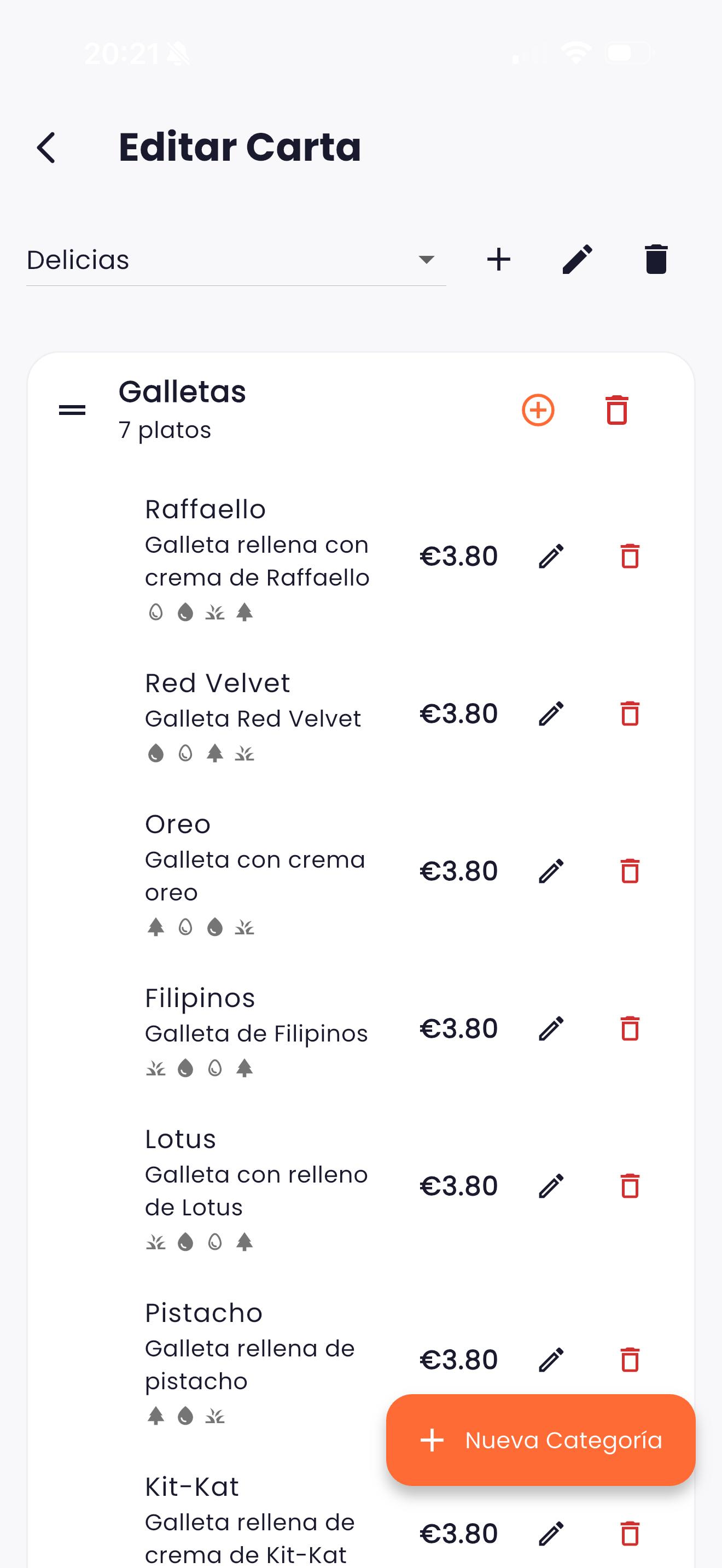 Añade categorías, platos, precios y alérgenos.